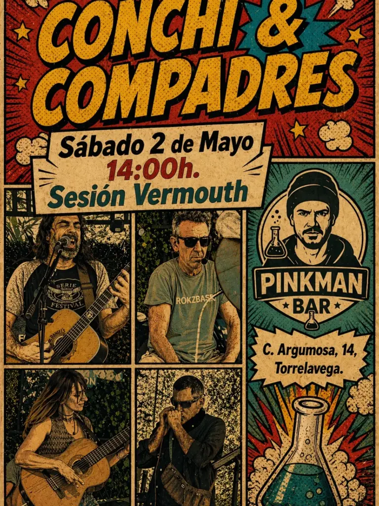 El sábado 2 de mayo, Pinkman Bar en Torrelavega acoge una nueva sesión de vermut con música en directo protagonizada por Conchi & Compadres. Este concierto forma parte de la apuesta decidida del local por la música en vivo, tras el éxito de los últimos conciertos celebrados en las semanas anteriores. La cita es a las 14:00 horas en un ambiente relajado y perfecto para disfrutar de buena música mientras saboreas un vermut. Conchi & Compadres promete mantener el alto listón musical que ha caracterizado la programación reciente de Pinkman Bar. Una oportunidad perfecta para descubrir nuevos sonidos en un formato íntimo y cercano, ideal para las tardes de fin de semana
