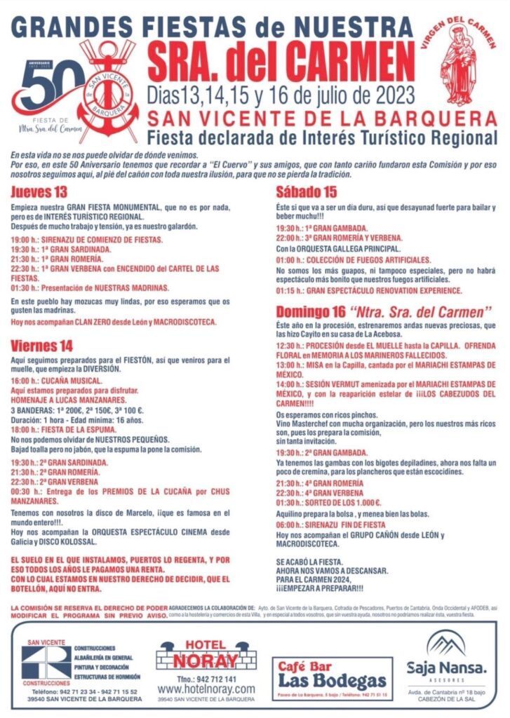 Las grandes Fiestas del Carmen 2023 de San Vicente de la Barquera (Cantabria), se une a las festividades de otros municipios de la región que celebran este honorable evento, principalmente aquellos situados en las zonas costeras. Esta fiesta está reconocida como una de las Fiestas de Interés Turístico Regional de Cantabria.