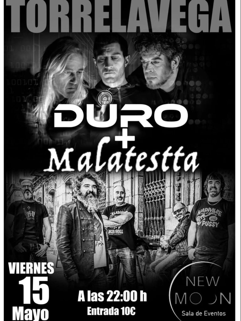 No te pierdas una noche llena de energía y rock en directo en Torrelavega. El viernes 15 de mayo, la sala NEW MOON se convierte en el escenario perfecto para el concierto de Malatestta y DURO +, dos bandas que prometen una noche inolvidable con su música en vivo. Con una entrada a solo 10€, este evento es una gran oportunidad para disfrutar de un concierto de alto nivel en un ambiente cercano y vibrante. No faltes a este concierto que combina talento, pasión y una atmósfera única. ¡Reserva tu entrada y prepárate para una noche de rock en directo!