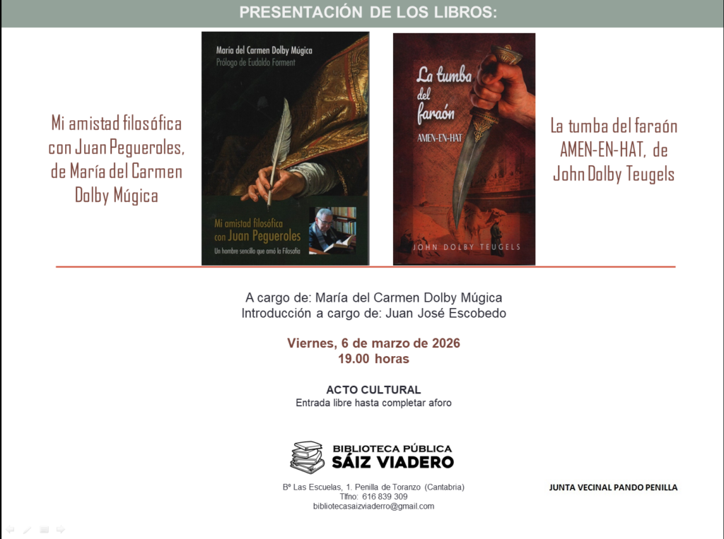 La Biblioteca Pública Saiz Viadero acoge la presentación de los libros “Mi amistad filosófica con Juan Pegueroles. Un hombre sencillo que amó la filosofía” y “La tumba del faraón Amen-En-Hat”, a cargo de Carmen Dolby Múgica, autora del primer libro.