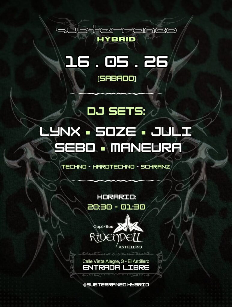 Prepárate para una noche inolvidable en el corazón de El Astillero. El sábado 16 de mayo, Rivendell se transforma en el epicentro de la música electrónica con Subterraneo Hybrid, una fiesta de techno, hardtechno y schranz que promete 5 horas de música ininterrumpida. Con DJ sets de @siempre_julio, @acidoscar.99, @ilynxx.x, @xmarietinha y @sebo.seb17, el evento ofrece un sonido potente y una atmósfera intensa que solo se vive en el subsuelo. Entrada libre, ambiente libre y una noche de baile sin límites. No te pierdas esta experiencia de música pura en uno de los locales más emblemáticos de Cantabria