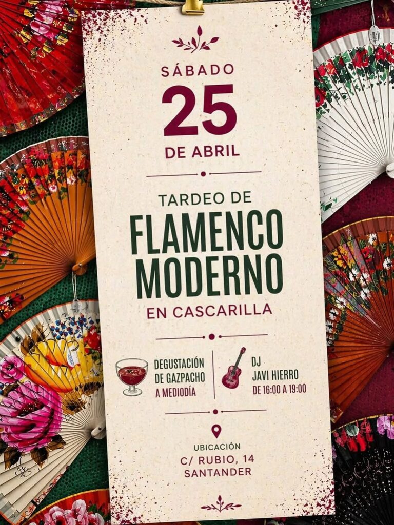 Disfruta de una tarde única en Cascarilla, Santander, con el Tardeo de Flamenco Moderno. Desde las 16:00 hasta las 19:00, DJ Javi Hierro te llevará en un viaje musical donde los ritmos flamencos se fusionan con beats modernos. Antes de la fiesta, a mediodía, disfruta de una refrescante degustación de gazpacho, un aperitivo perfecto para abrir boca. Un evento que combina la tradición con la innovación, en un ambiente cálido y acogedor. No te pierdas esta experiencia única en el corazón de Santander