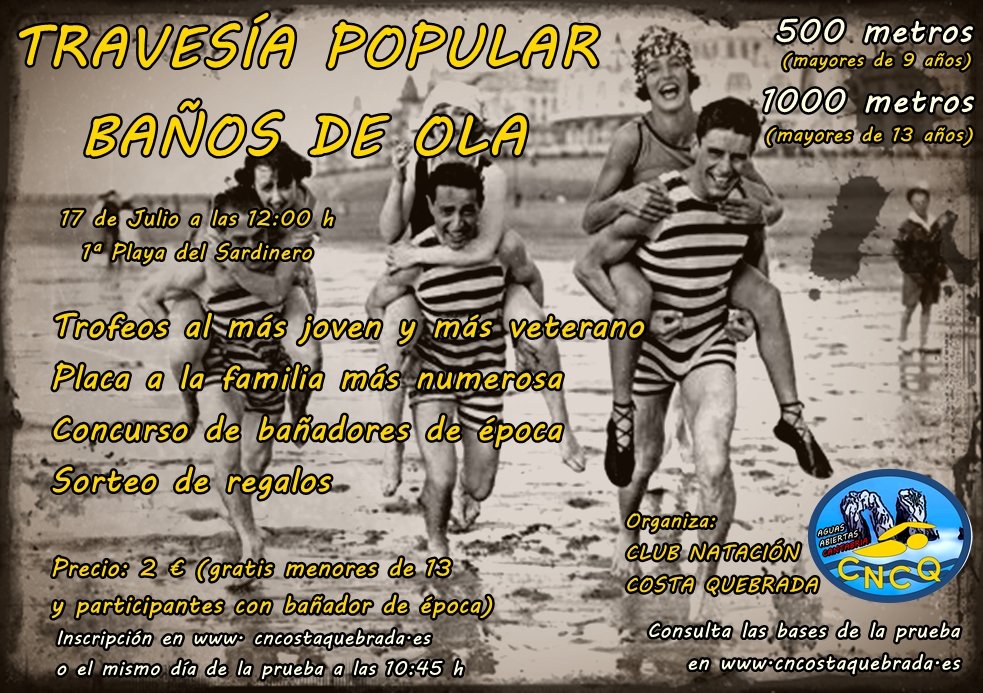 Travesia popular Baños de Ola en Santander 2016. Ya puedes inscribirte para la Travesía de Baños de Ola del próximo 17 de Julio. Hay muchas novedades así que lee con detenimiento las bases de la misma. Al igual que en anteriores pruebas organizadas por el C.N Costa Quebrada, os pedimos que si tenéis pensado participar, realicéis el descargo de responsabilidad del evento y lo traigáis firmado de antemano para facilitar la gestión de la misma.