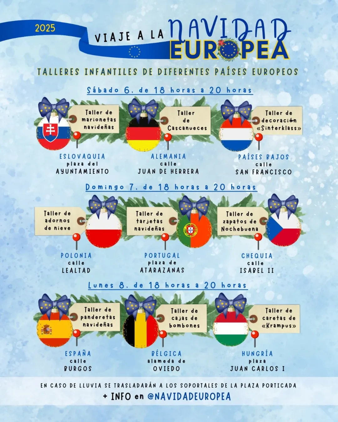 En esta edición se visitarán Eslovaquia, con su tradición de marionetas; Alemania, con sus cascanueces; Países Bajos, para conocer al personaje de ‘Sinterklaas’; Polonia, vinculada a la nieve; Portugal, con sus postales navideñas; Chequia, con la tradición del zapato de Nochebuena; Bélgica, con su conocido chocolate; Hungría, a través del personaje “Krampus”, y por primera vez España, con su tradicional pandereta navideña. Todas estas tradiciones se han adaptado al formato de talleres infantiles para garantizar una experiencia lúdica, accesible y enriquecedora.