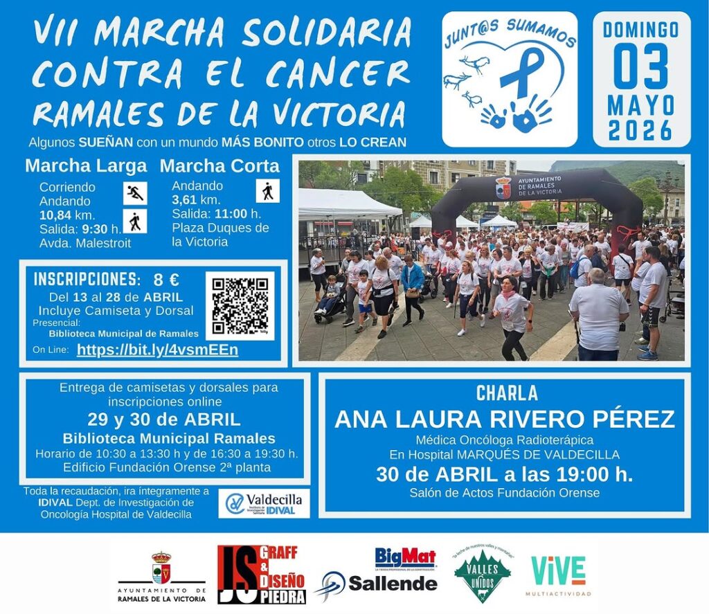 Únete a la VII Marcha Solidaria contra el Cáncer en Ramales de la Victoria, un evento lleno de energía, compromiso y solidaridad. Este domingo 3 de mayo, podrás participar en dos recorridos: una marcha corta de 3,61 km con salida a las 9:30 h y una larga de 10,84 km a las 11:00 h, ambas desde la Plaza Duques de la Victoria. Todo el dinero recaudado irá íntegramente a la investigación oncológica del Hospital de Valdecilla. Las inscripciones, que incluyen camiseta y dorsal, cuestan 8 € y se pueden hacer presencialmente en la Biblioteca Municipal Ramales o en línea hasta el 28 de abril. El 29 y 30 de abril, se entrega el dorsal y la camiseta en la biblioteca. Además, el 30 de abril a las 19:00 h, en el Salón de Actos de la Fundación Orense, la médica oncóloga Ana Laura Rivero Pérez impartirá una charla sobre el cáncer. No te lo pierdas: cada paso cuenta. ¡Únete a la causa!