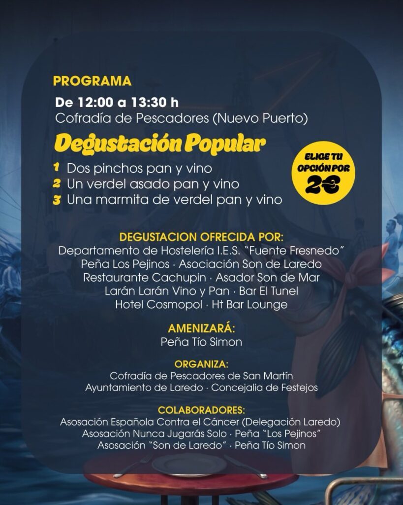 Este sábado, 25 de abril de 2026, no te pierdas el XXII Día del Verdel en la Cofradía de Pescadores San Martín de Laredo. Una celebración gastronómica que reúne lo mejor de la costa cántabra con una degustación popular por solo 2€. Puedes elegir entre dos pinchos, un verdel asado o una marmita de verdel, todo acompañado de pan y vino. El evento se celebra de 12:00 a 13:30 horas en el Nuevo Puerto, un espacio emblemático de Laredo. Organizado por el Ayuntamiento de Laredo y la Cofradía, con el apoyo de numerosos establecimientos locales, es una cita obligada para disfrutar de la tradición marítima y la buena comida en un ambiente festivo y acogedor. ¡No te lo pierdas!